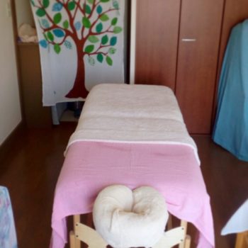 マッサージベッドはアースライト社製のもの。もう10周年の付き合いとなるこのベッド。タオルがかけてあるので見えませんが、あたらしく皮を張りなおしてもらいました。お友達で自分で変えたとのブログをみて、いそいそと相方さんにお願いしました。皮の張り具合でベッドのクッション具合も変わるという考えてみれば当たりまえなのですが、そんな発見もありました。
